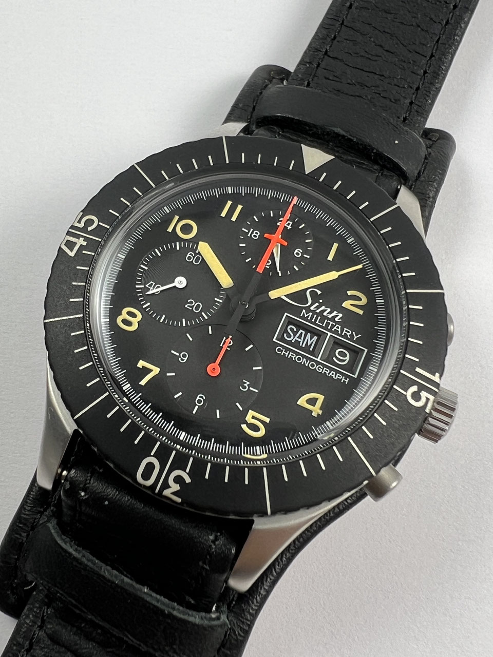früher Sinn Spezialuhren Sammler - Chronograph Modell 156 Military mit Lemania 5100 Uhrwerk aus den achtziger Jahren. Die Uhr befindet sich in einem sehr schönen Sammlerzustand mit nur leichten Gebrauchspuren! (Lünette mit einigen Gebrauchsspuren) - Auf Wunsch Fabrikneue Lünette gegen Aufpreis montierbar - siehe Bilder . Tritium Zifferblatt & Zeiger gealtert mit Patina. Durchmesser ca. 43mm / Höhe ca. 16mm . Original Sinn "NSA" Edelstahlarmband.